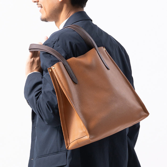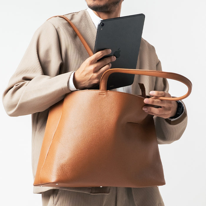 シュリンクレザー シンプル スマホポケット付き本革トートバッグ