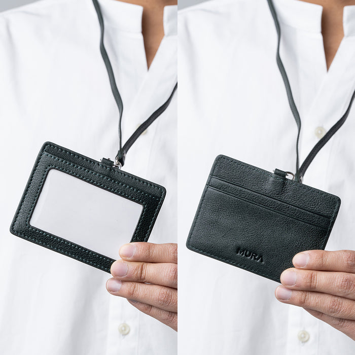 牛本革 ネックストラップ付 伸縮リール IDカードケース