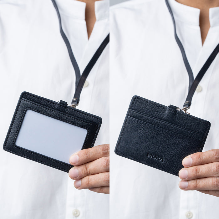 牛本革 ネックストラップ付 伸縮リール IDカードケース