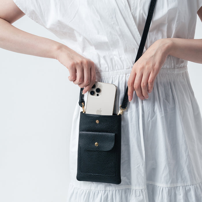 フルグレイン シュリンクレザー スナップボタン スマホショルダーバッグ