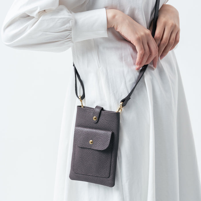フルグレイン シュリンクレザー スナップボタン スマホショルダーバッグ