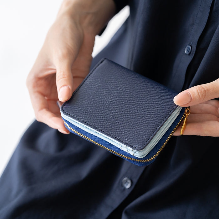 ツートンカラー サフィアーノ&ゴートレザー スキミング防止機能付き ラウンドファスナー 二つ折り財布