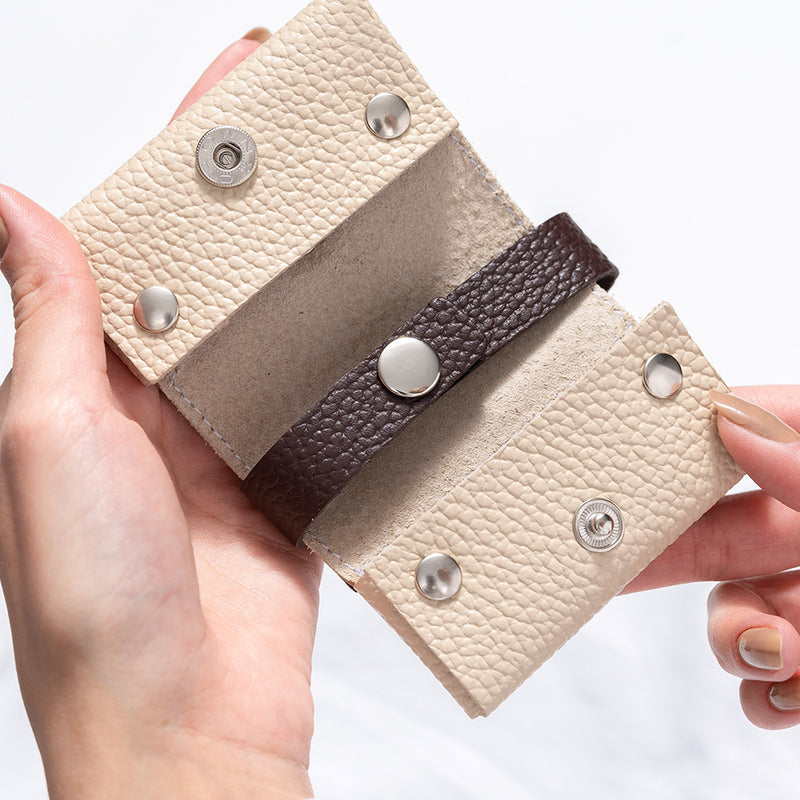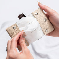 両端にポケットティッシュを入れ、片寄りがないように整えた後、半分に折り、スナップボタンで留めます。無駄のない最小の収納設計です。